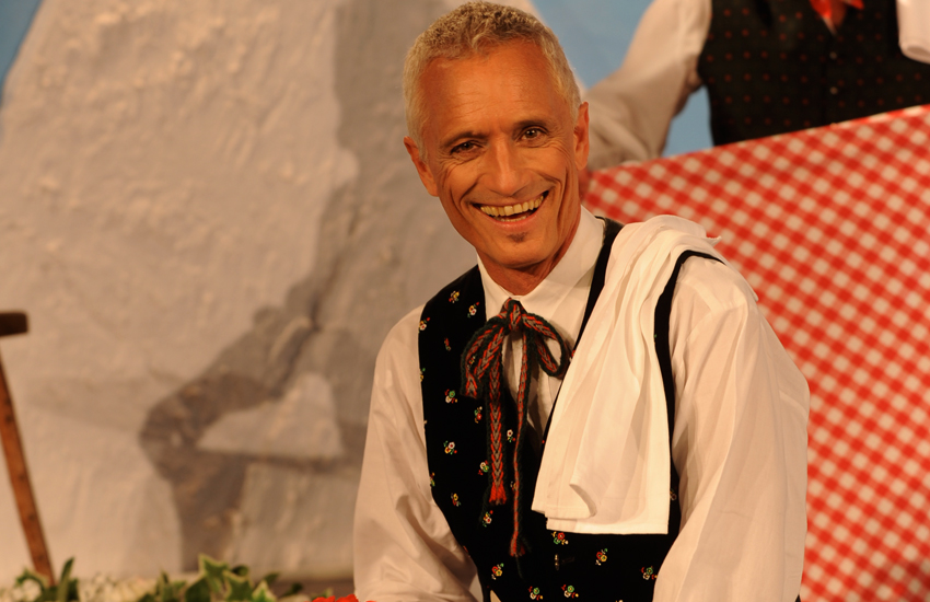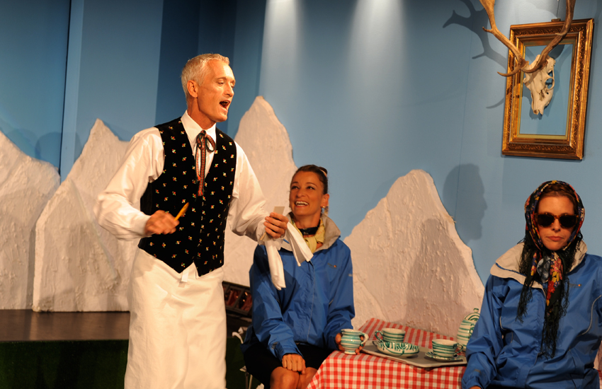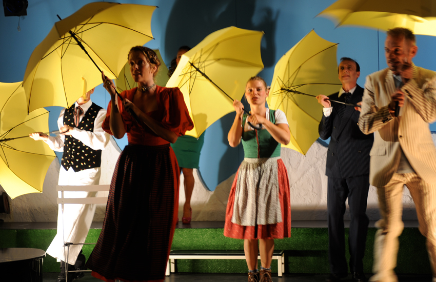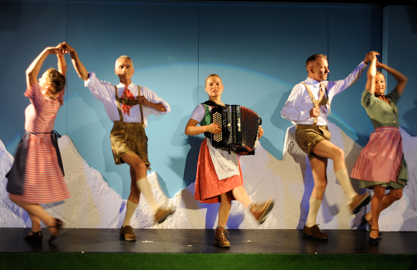 Im Grunde macht’s in der Brechung noch viel mehr Spaß, wenn etwa die so genannten Tanz-Evolutionen zur Karikatur des Genres werden, aber trotzdem mit hoher choreographischer Kompetenz. Oder wenn die Aura eines Kuhstalls mit poppigen Kuhfellteppichen und –westen herbeigezaubert wird (Bühne, Kostüme: Herbert Wolfgang). Fürs rechte Bergkolorit wiederum genügen ein paar schneeweiße Styropor-Gipfel, je abstrahierter und minimaler die Form, desto maximaler die Wirkung.